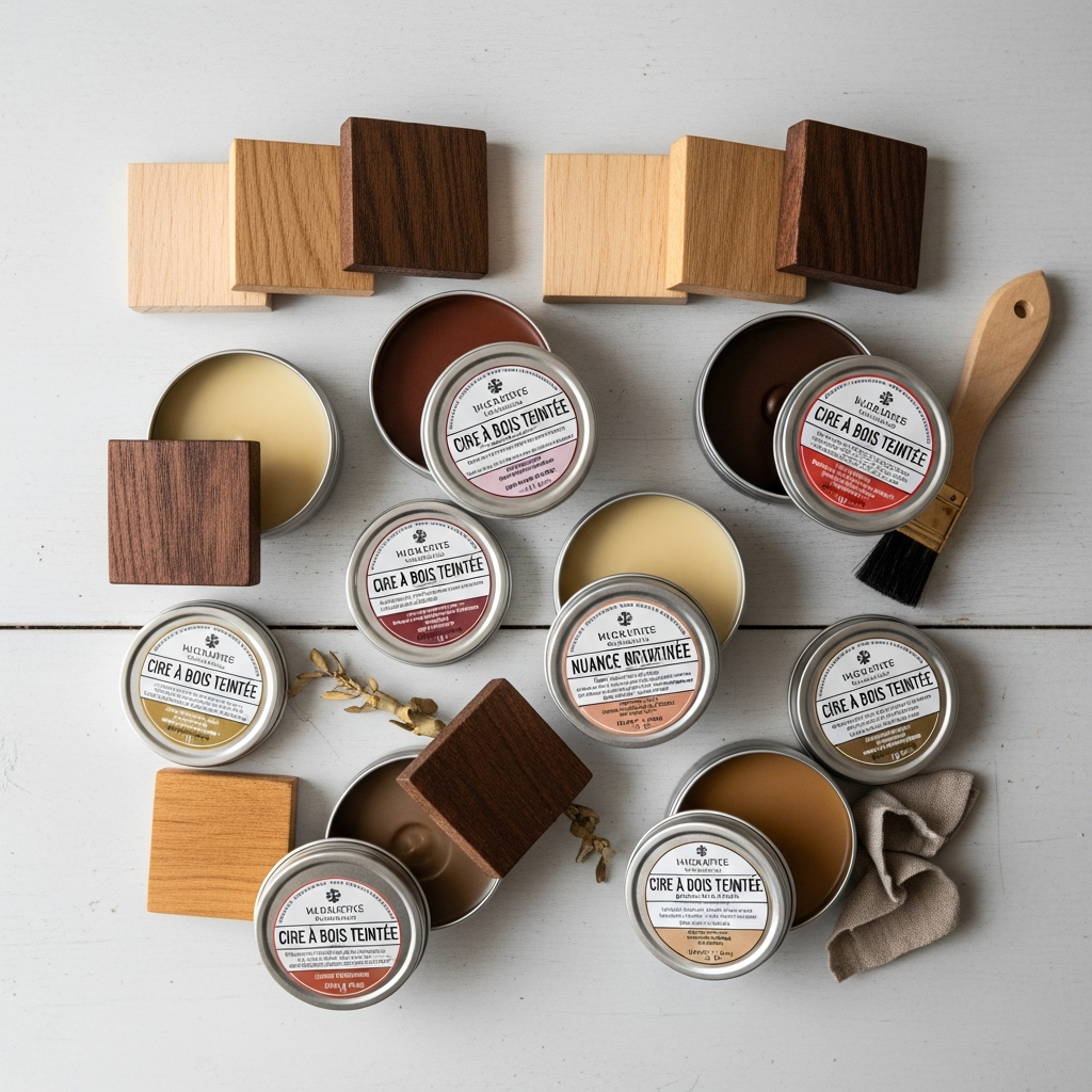 Les essences exotiques claires (érable, frêne) acceptent bien les cires colorées. Testez des teintes originales : vert d'eau, gris anthracite ou même rouge bordeaux pour des effets contemporains.